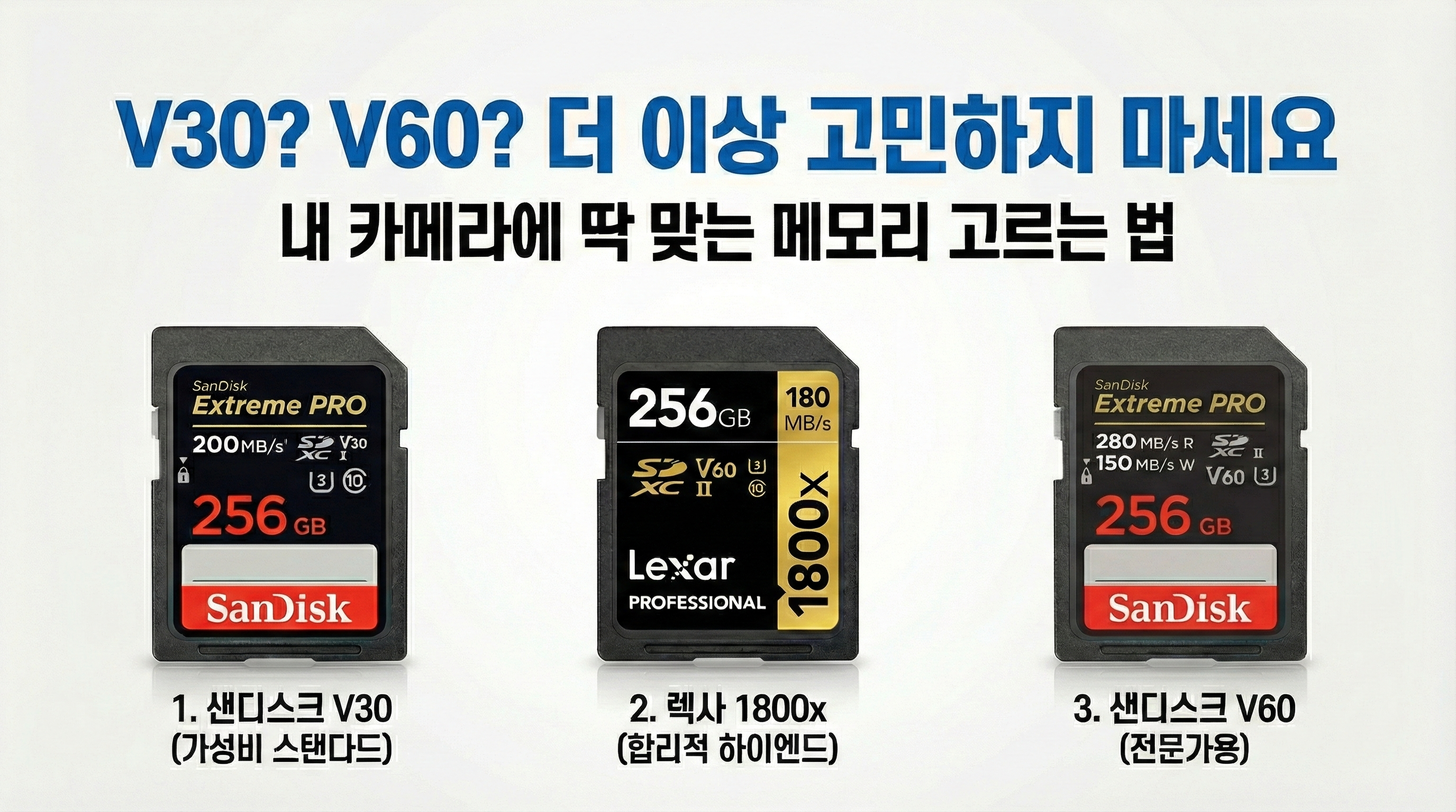 | 구분 | 샌디스크 Extreme PRO V30 | 렉사 1800x Gold V60 | 샌디스크 Extreme PRO V60 정품 |